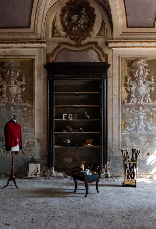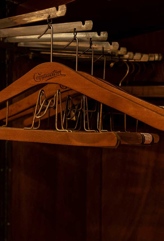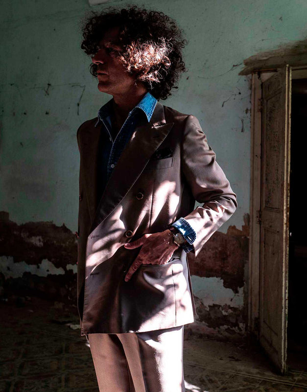 "Abito tre pezzi Cooper in Harris Tweed, camicia in denim lavato, cravatta in maglia di cashmere".