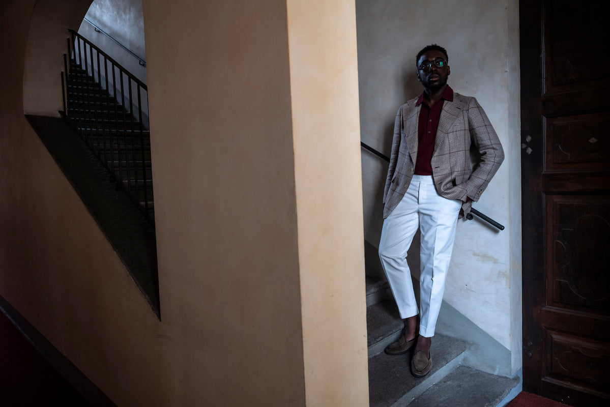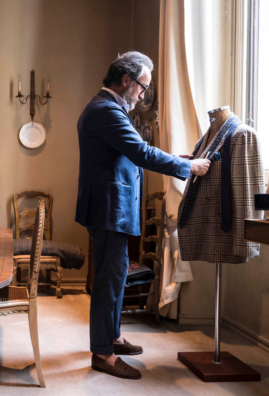 "Giacca Greg in lana, lino e seta, camicia in cotone Jermyn, cravatta in lino a quadri vintage, pantaloni in cotone".